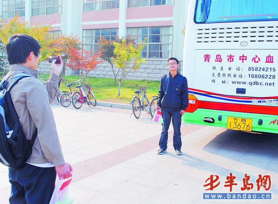 青島農(nóng)業(yè)大學(xué)的學(xué)生獻(xiàn)完血后在采血車旁留影。