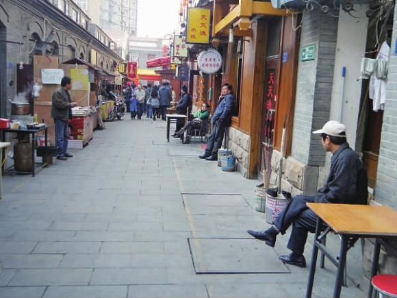 雖然正值用餐時間,除了江寧會館之外,整個劈柴院的人很少。在一段時間里,院內狹窄的通道上站的店員比游客都多。記者發現,原本經營特色小吃的劈柴院風情館里面漆黑一片,通往風情館小吃街的通道也被小吃車堵住了。原本在里面經營的12家特色小吃店不知去向,而風情館緊鄰的一家養生粥鋪也落了鎖,貼出轉讓的告示。膠東大包子鋪關門,重慶老鴨湯不見蹤影,經營工藝品的游藝居人去樓空,巷里的多個烤肉攤也空置了起來。