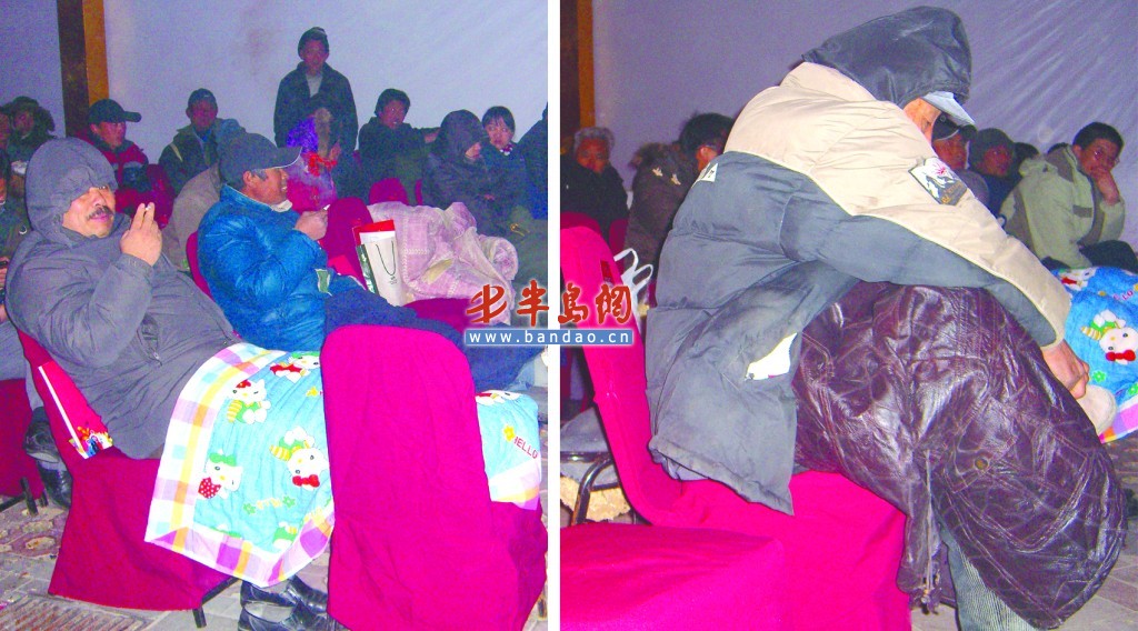 左圖:寶龍廣場三期開盤,數(shù)十名購房者自帶被褥連夜排隊搶購。右圖:60歲的袁大爺被人雇來排隊。