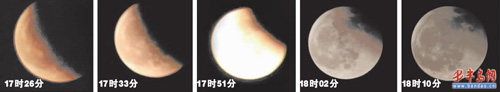 青島觀象臺臺長孫立南介紹說,剛看到月亮時,已經(jīng)到達生光階段。這時月亮呈現(xiàn)出紅色,是因為地球擋住了太陽的光輝,只有部分太陽光經(jīng)過地球大氣層折射后打到了月亮上 ,就像傍晚時分,天空中的云層會變成紅色一樣。后來,地球的遮擋越來越少,月亮就呈現(xiàn)出本來的黃色。“這次看到的‘帶食而出’雖然很美麗,但觀測條件并不是很有利,不能看到月全食的全部過程。”孫立南說,天文愛好者明年還有觀賞月食的機會,分別在6月16日和12月10日 。6月16日的是月偏食,12月10日那次,我國可以看到月全食的全過程。