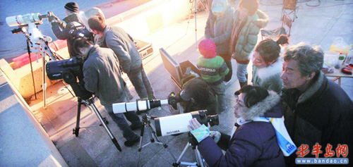 青島天文愛好者在雕塑園通過天文望遠鏡欣賞月食。