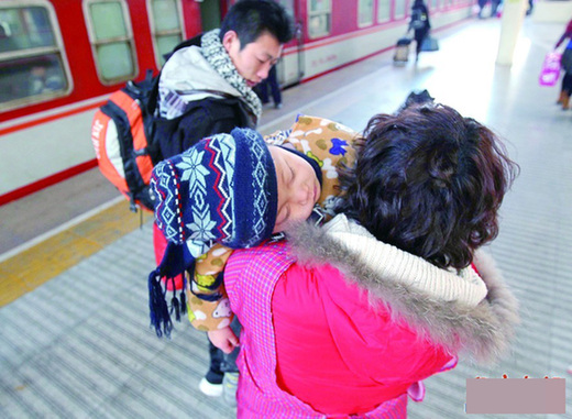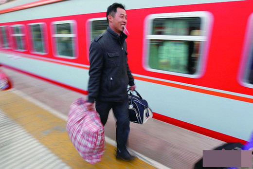 一位旅客即將登上返鄉(xiāng)的列車,激動(dòng)的心情寫在臉上。