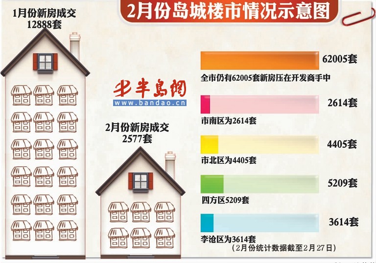 2月28日記者了解到,樓市供應(yīng)量方面,全市仍有62005套新房壓在開發(fā)商手里。其中市內(nèi)四區(qū)方面,市南區(qū)為2614套,市北區(qū)為4405套,四方區(qū)為5209套,李滄區(qū)為3614套。