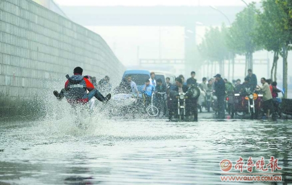 從7日夜間開始,我省自西向東出現(xiàn)降雨天氣,截止到8日15時,全省共有98個縣(市)出現(xiàn)降水。淄川降雨量高達(dá)106.6毫米。圖為8日在濟(jì)南市歷山路一鐵路橋附近,一位市民不顧積水深淺,