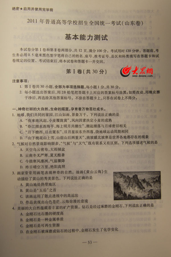2011年山東高考基本能力測試試題及參考答案