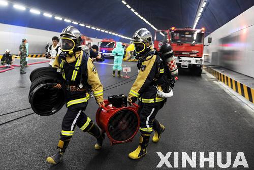 新華網(wǎng)山東頻道6月21日電 當(dāng)日,青島市公安消防局在即將通車的青島膠州灣海底隧道內(nèi)舉行消防應(yīng)急處突綜合演練,以檢驗(yàn)和提高消防部隊(duì)?wèi)?yīng)對(duì)隧道各類突發(fā)事故的救援處置能力。