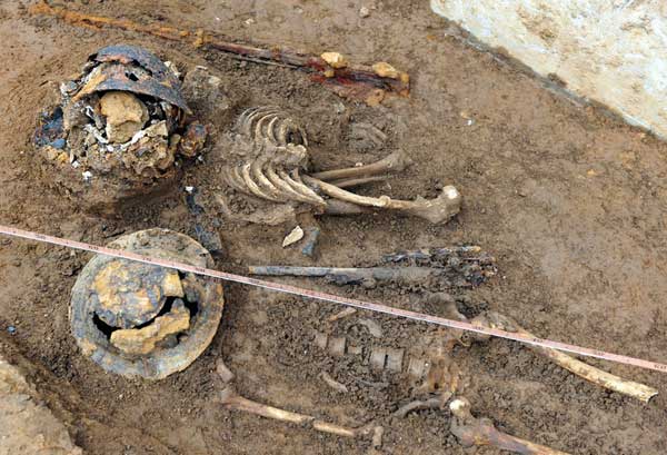 9月23日,在山東棗莊臺兒莊古城重建施工現場,西門城墻下,清理水系的工人們發現了兩具頭戴鋼盔的尸骨殘骸。