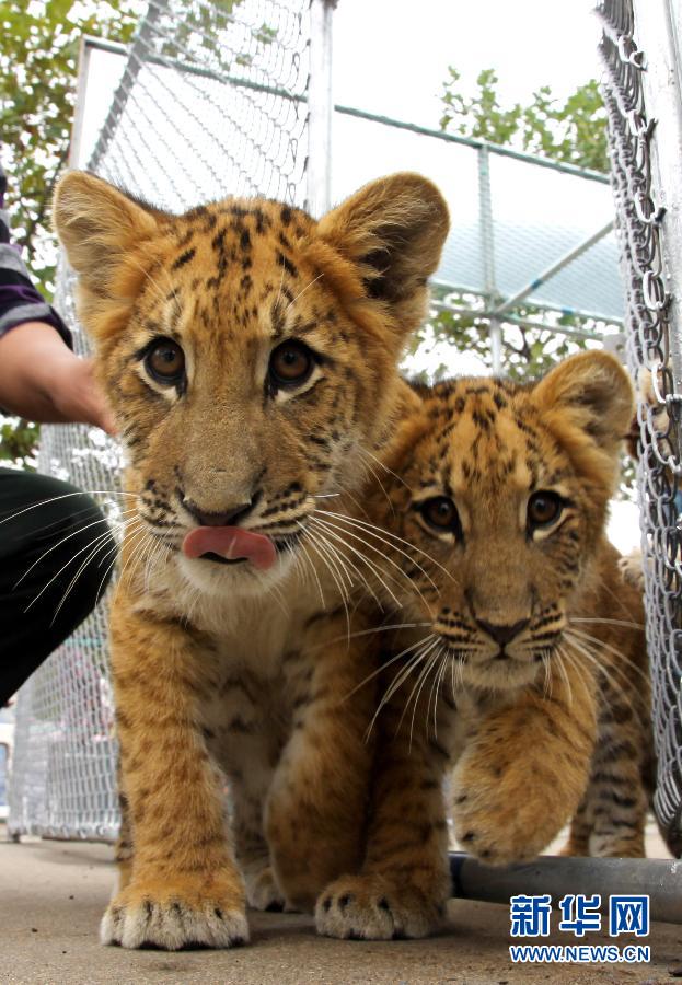 10月1日,在威海西霞口野生動物自然保護區,兩只小獅虎獸從籠中走出來。當日,山東威海西霞口野生動物自然保護區出生142天的小獅虎獸首次與游客見面。據介紹,這兩只獅虎獸長勢良好,體重已超過15公斤。由于是人工飼養,它們的性情較為溫和,喜與人親近。獅虎獸是雄性獅子與雌性老虎交配產生的后代。幼獸由于先天不足等原因,成活率很低。據資料顯示,目前世界上存活的獅虎獸只有20只左右。新華社發(于啟波 攝)