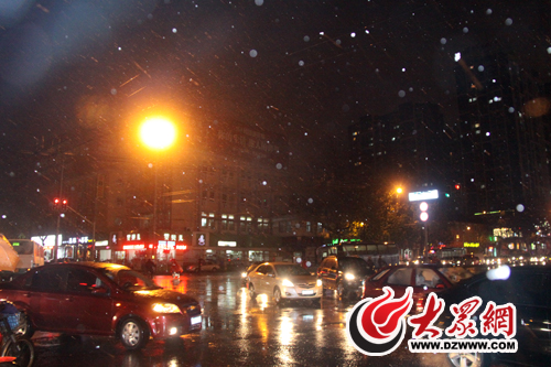 今天下午5:00,濟南市民期待已久的降雪終于來了。一開始,小雪夾雜著雨滴降臨,持續到5:40左右,濟南市區的天空已經飄滿了雪花。