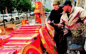 1月14日,農歷臘月廿一,濟南市繞城高速以內的區域,煙花爆竹指定銷售點紛紛開張了。圖為文化西路一商家將各種煙花爆竹擺上街面,供市民們選購。買回煙花爆竹不能立馬燃放,跟往年一樣,只能等到農歷小年。