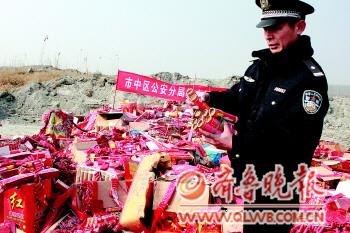 6100萬頭爆竹、1100多個煙花、80多個禮花彈隨著噼里啪啦的一陣巨響,化為灰燼。28日上午,濟寧市公安局中區分局在市中區105國道濟寧電廠煤灰廠空曠地帶,集中銷毀了一批非法煙花爆竹。據民警介紹,這些非法煙花爆竹大都是仿冒、偽劣產品,很容易傷人。 本報記者 岳茵茵 本報通訊員 孟翔鯤 李新輝 攝影報道