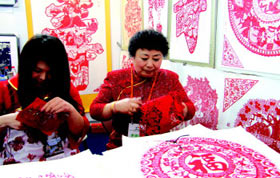 4月13日,10多位山東省民間手工藝制作大師在2012中國(guó)國(guó)內(nèi)旅交會(huì)上現(xiàn)場(chǎng)展演手工絕活兒,受到觀眾青睞。展臺(tái)前人來(lái)人往,擠成了“疙瘩”。被稱(chēng)為“中國(guó)神剪”的朱曼華,訂單多得剪也剪不完,她的弟子在法國(guó)、韓國(guó)發(fā)展剪紙事業(yè)。許多民間工藝走出國(guó)門(mén)廣受歡迎,說(shuō)明:越是民族的,越是世界的。圖為朱曼華(右)和助手現(xiàn)場(chǎng)剪紙。