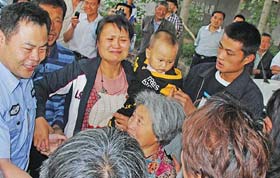 ▲5月22日,出席省第十次黨代會的煙臺代表團的代表報到后,興高采烈地將出席證佩戴在胸前!跤浾摺蛎瘛》抠t剛 報道