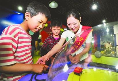 泉城義工陪伴殘障兒童在省科技館內體驗科技魅力。(本報記者 崔健 攝)