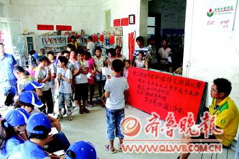 6月3日,在巨野龍堌鎮(zhèn)鹿樓村的“新農(nóng)村圖書館”里,孩子們正在準(zhǔn)備朗誦比賽(左圖)。這家圖書館是該村的“80后”大學(xué)生鹿海斌自費(fèi)創(chuàng)辦的,圖書館每天能吸引七八十個(gè)十里八鄉(xiāng)的兒童和十幾名老人,有200多名孩子在這里辦了借書證。上圖為鹿海斌和孩子們?cè)谝黄稹! ”緢?bào)記者 梁斌 攝
