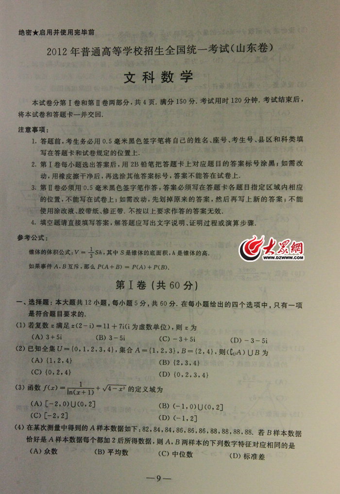2012年山東高考文...
