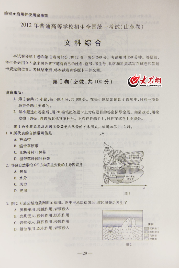2012年山東高考文科綜合試題及參考答案