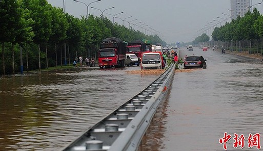 6月21日傍晚,濟南東部郊區(qū)突降暴雨,一時間馬路成河,交通阻斷,不少車輛被淹。水位下降后,大車才緩慢通過。近日濟南干旱少雨,這場大雨對于緩解旱情十分有利。圖為21日傍晚,濟南東部郊區(qū)突降暴雨,一時間馬路成河,交通阻斷。