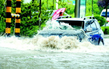 7月8日,臨沂市突遭強降雨襲擊,車輛在積水路段涉水行駛。