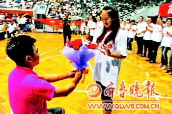 15日,濟南皇亭體育館。經歷了一個暑假后,這個擁有近四千人的超級考研輔導班即將結束。一些在學習期間產生的愛情此時也紛紛顯現:休息時間,大屏幕上不斷顯現男生女生發出的求愛信息,還有一位來自山東藝術學院的學生當場向一位女生獻花求愛,引發全場歡呼。本報記者 周青先 攝