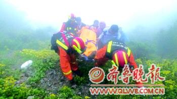 ◥救援人員用擔架將跳崖小伙抬到索道站。本報通訊員程國棟蔣韓攝