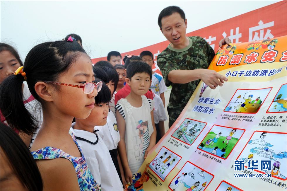 7月18日,青島小口子邊防派出所警官在給轄區(qū)小學生講解防溺水安全小常識。
