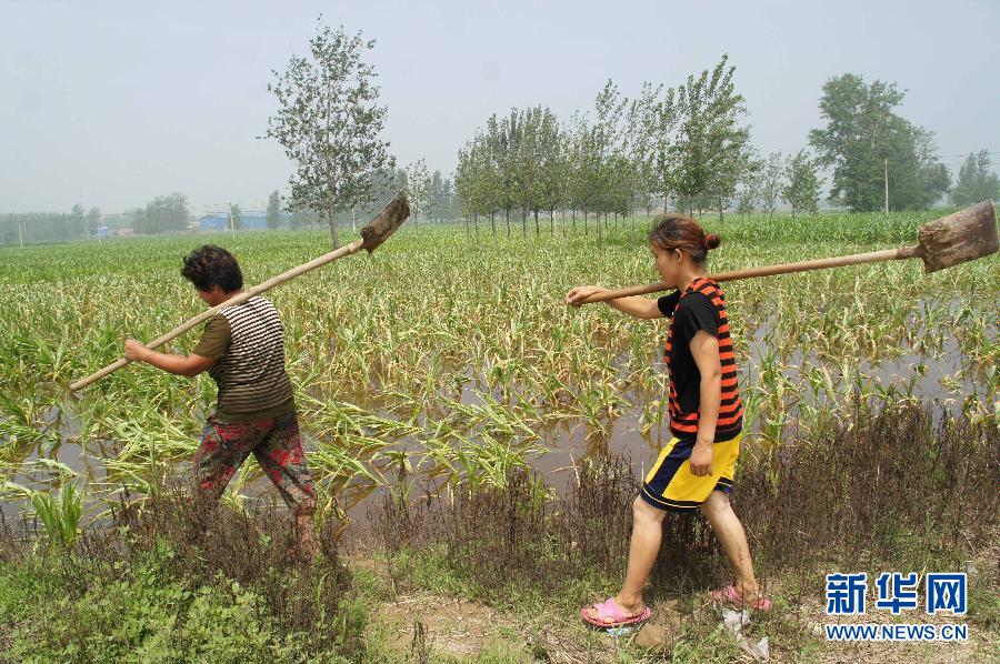 7月24日,在山東省聊城市經(jīng)濟技術(shù)開發(fā)區(qū)蔣官屯,兩名婦女經(jīng)過遭強降雨后的農(nóng)田。近日,山東全省連續(xù)遭遇強降雨襲擊。據(jù)山東省人民政府防汛抗旱指揮部辦公室24日最新統(tǒng)計,該省農(nóng)作物受災(zāi)面積已達614萬畝。新華社發(fā)(張憲舉 攝)