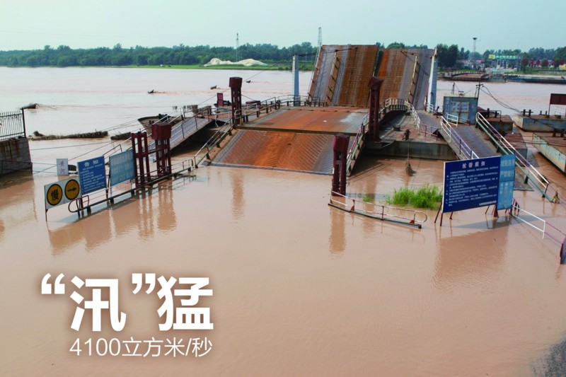 27日,黃河水漫過山東濟南濼口浮橋南公路口。當日18時,黃河山東艾山水文站出現高達4100立方米/秒的今年最大流量。近日,受干支流來水及降雨影響,黃河小浪底水庫下泄流量逐步增大,洪水正在山東境內向下游推進。黃河山東段54座浮橋已全部拆除,以應對洪峰,確保安全度汛。黃河防汛抗旱總指揮部已于7月24日發布黃河中下游防汛藍色預警,并啟動防汛Ⅳ級應急響應。 新華社發