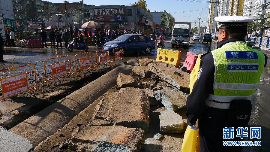 11月7日,交警在處置濟(jì)南市黃臺南路地下供熱管道爆炸現(xiàn)場。當(dāng)日上午,濟(jì)南市黃臺南路的地下供熱管道發(fā)生爆炸,導(dǎo)致路面被掀翻十幾米,數(shù)人受傷。 新華社發(fā)