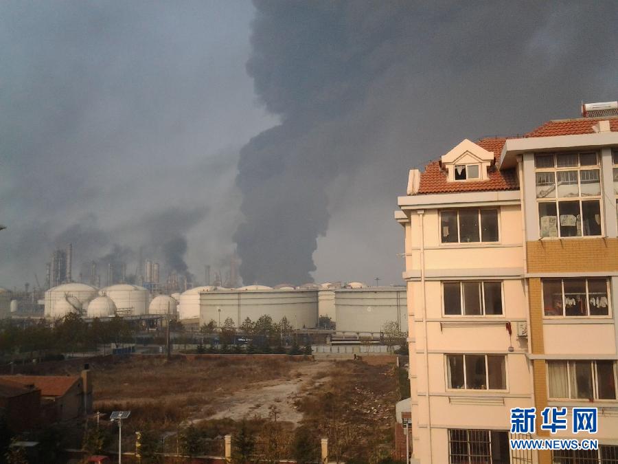 這是11月22日拍攝的爆炸現場(手機拍攝)。當日凌晨3時許,青島市黃島區中石化黃濰輸油管線一輸油管道發生破裂事故,造成原油泄漏。上午10時許,在搶修過程中,管道破裂處起火。目前當地政府正組織力量緊急處置。傷亡情況和事故原因正在調查中。新華社發