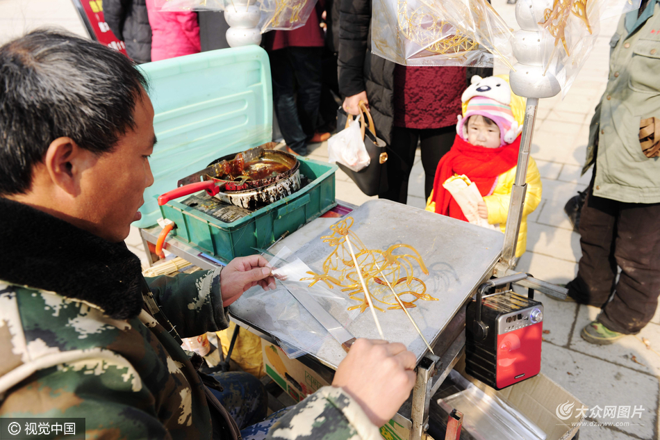 2017年2月1日,山東日照杏坊村廣場,邢師傅在制作糖畫,據(jù)了解邢師傅是山東莒南人,由于制作糖畫動物栩栩如生深受顧客的喜愛,一天能掙200-300元,生意好時還能到一千左右,總體比在外打工要好的多,自己也很知足。