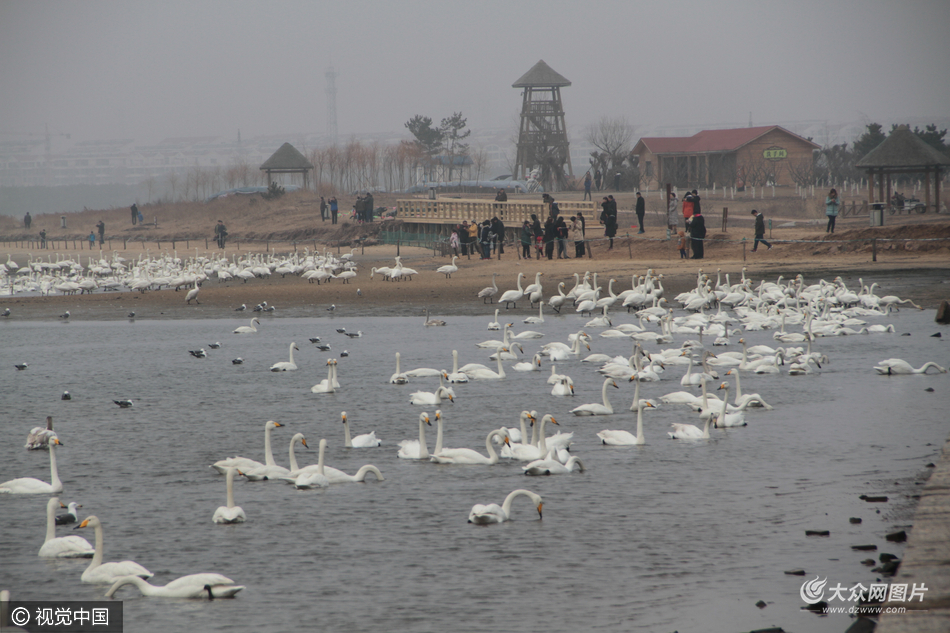 2017年02月05日,山東省威海榮成市天鵝湖和煙墩角附近的天鵝與海鷗吸引眾多游客前來喂食。