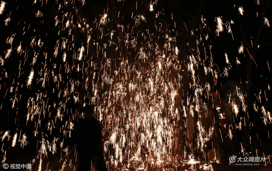 2017年02月08日,山東省濟寧市,傳承了300多年的民間藝術“打鐵花”在道教文化圣地山東省鄒城市大束鎮葛爐山精彩上演。民間藝人手拿木棍將鐵汁濺向附近的道具——一棵枝條繁多的大柳樹,借助柳條的姿態化作巨型花朵狀綻開,鐵水變煙花,金花四濺,流光溢彩,讓人拍手叫絕。