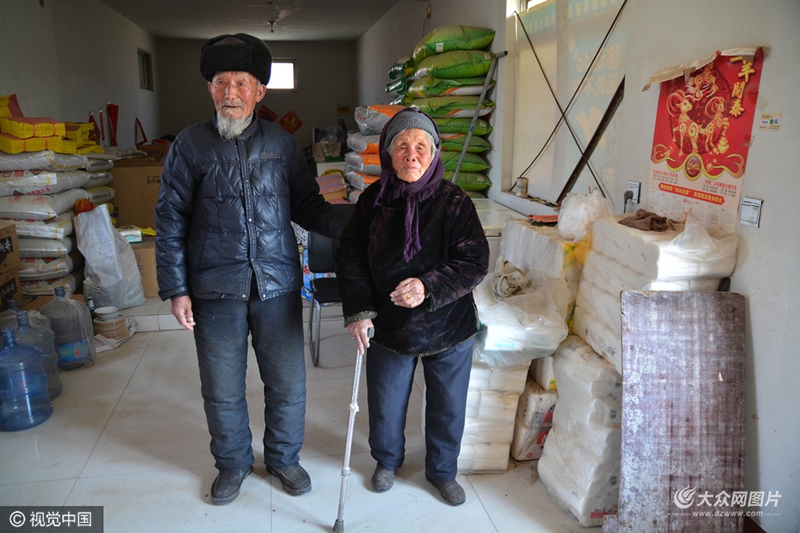 2017年2月12日,山東日照,今年86歲的徐永發(fā)老人和88歲的老伴杜秀蘭,是莒縣龍山鎮(zhèn)徐家阿疃村普通村民。他們自1953年結(jié)婚以來,兩人在大山深處,以種地為生,互相照顧,共同攜手,至今已經(jīng)走過了63個春秋。