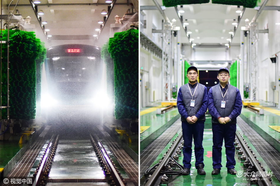 雖然洗車的是機器,但這并不代表洗車工的工作就是坐辦公室。洗車的時候,一名洗車工在操作機器,另一名則必須在現場。當晚8點,從晚高峰先退下來的車輛駛入了洗車車間,當車間兩側門全都打開的一瞬間,一股寒風撲面而來。緊接著洗車機開始噴水,冰冷的小水滴隨著風打在臉上,感覺相當冷。張揚說,8點這班還算好的,冬天是越晚天氣越冷,等最后一列地鐵回場,基本上都是11點往后,那個感覺才是“真的過癮”。(圖片作者:孫志文 于泓/視覺中國)