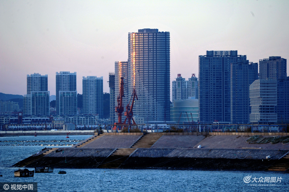 2017年2月23日,夕陽映照在山東青島唐島灣畔新建的大樓上。