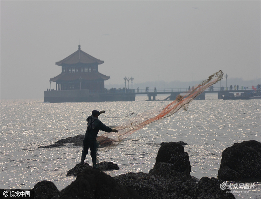 2017年2月28日,青島,市民在棧橋海域捕魚。