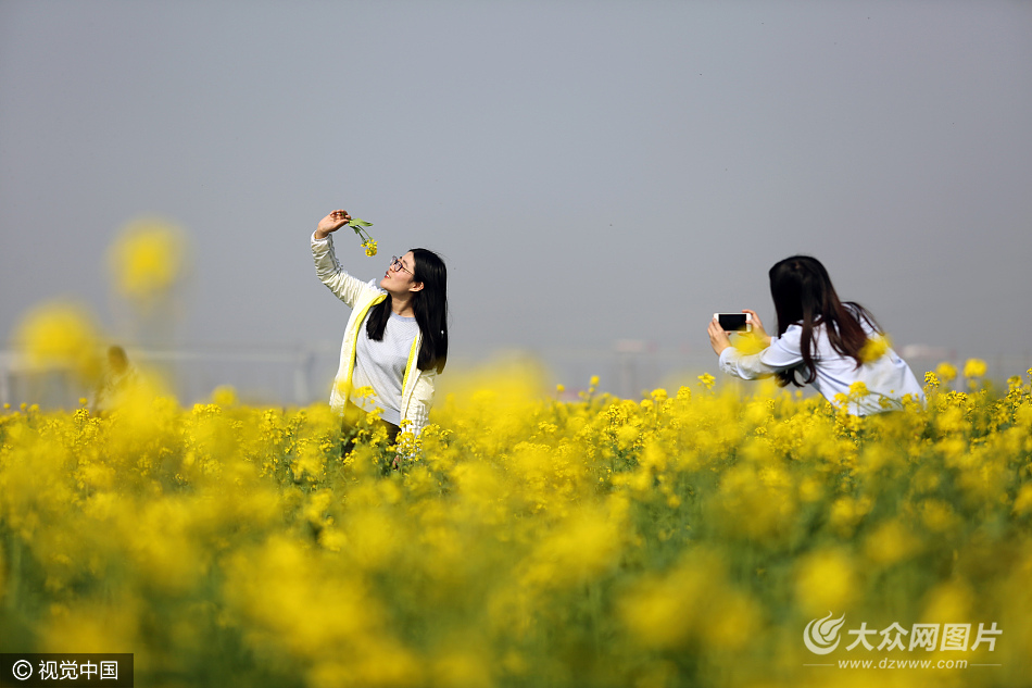 2017年4月6日下午,游客在山東省東營市墾利區黃河人家旅游度假區油菜花叢中游玩拍照。日前,度假區內500畝油菜正值盛花期,連綿不絕的油菜花競相開放,景色十分壯觀,吸引游客前來感受明媚春光美景。當地依托資源優勢,緊緊圍繞旅游抓農業,大力發展休閑農業和鄉村旅游,有力地促進了當地農民增收致富。