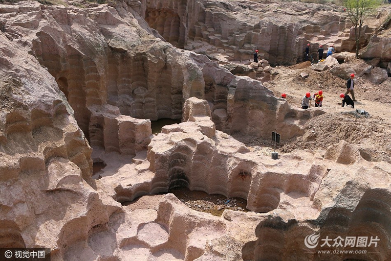 2017年4月10日,山東即墨環秀街道辦事處前南莊村的村民在挖掘清理塵封的“石磨坑”。