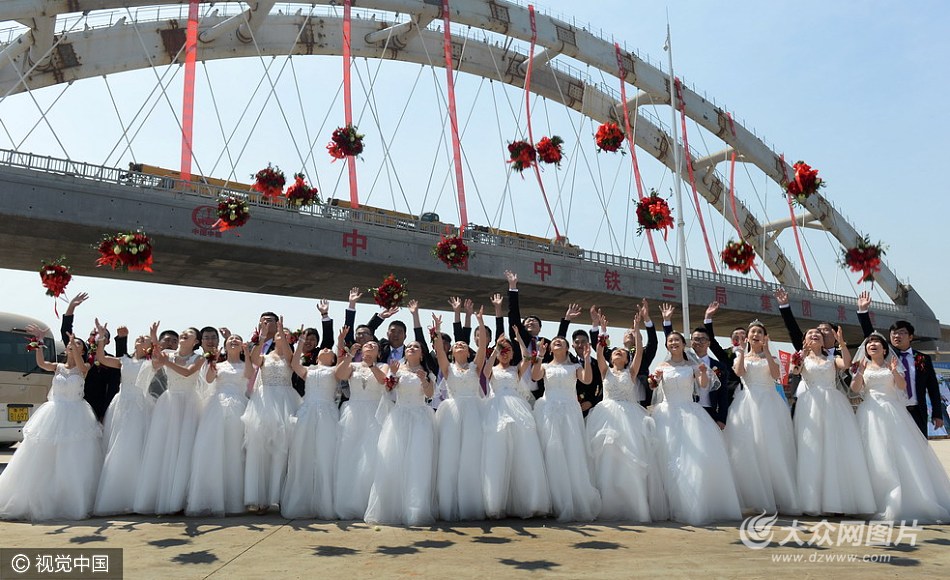 2017年4月26日,山東濱州,濟(jì)青高鐵中建三局項(xiàng)目部鄒平跨濟(jì)青高速特大橋工地,16對(duì)新人手挽著手走進(jìn)工友們?cè)诠さ貫樗麄兙脑O(shè)置的婚禮現(xiàn)場(chǎng),舉行集體結(jié)婚典禮。濟(jì)青高鐵是我國(guó)“四縱四橫”快速鐵路網(wǎng)的重要組成部分,是促進(jìn)山東省經(jīng)濟(jì)社會(huì)持續(xù)健康發(fā)展具有重要戰(zhàn)略意義的重要建設(shè)項(xiàng)目。參加建設(shè)的中鐵三局職工在施工過(guò)程中克服重重困難,在建設(shè)質(zhì)量和工程進(jìn)度上都創(chuàng)出了優(yōu)異成績(jī)。建設(shè)過(guò)程中,為了趕工期保質(zhì)量,許多年輕人無(wú)暇顧及自己的私事,甚至舍棄了自己的假期。為了激發(fā)建設(shè)工人的干勁和激情,濟(jì)青高鐵中鐵三局項(xiàng)目部經(jīng)過(guò)精心策劃,為職工在建設(shè)工地上舉辦了這次隆重且有意義的集體婚禮。工地上的婚禮上不僅新娘新郎的婚紗、婚戒等等一件不少,還請(qǐng)來(lái)了部分新人的家屬,更多的親人則是通過(guò)網(wǎng)絡(luò)轉(zhuǎn)播的方式在婚禮現(xiàn)場(chǎng)送來(lái)了祝福。婚禮結(jié)束后,新人們懷著感恩的心在他們親手建起的高鐵大橋前揮臂高呼,慶祝自己在人生的道路上又邁出了新的一步。