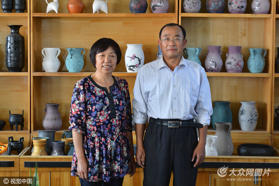 2017年5月2日,在山東省日照市莒縣夏莊鎮趙家孟堰村,蔡世連和丈夫趙玉彥在黑陶創作基地合影。為了幫助她一起創業,趙玉彥現在也學會了黑陶制作。
