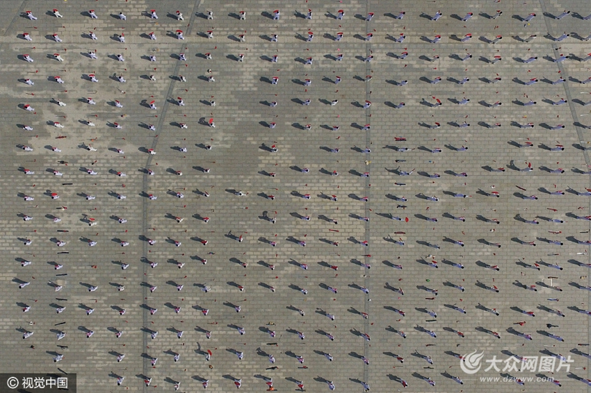 2017年5月7日,山東省濱州市,近千名太極拳愛好者齊聚一堂,共同表演太極拳、太極扇、太極劍場面震撼,倡導(dǎo)健康生活理念。