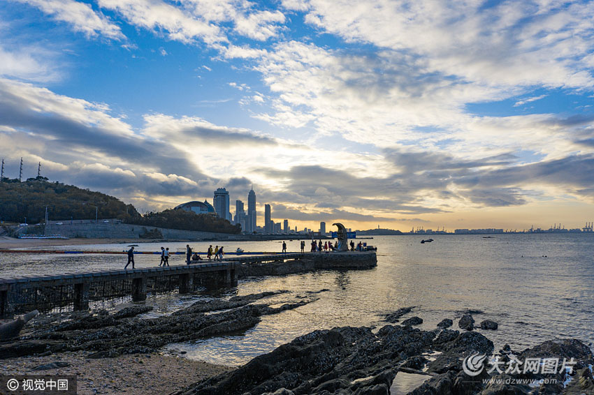 5月9日,煙臺,小雨過后,烏云散去,藍天重現,煙臺日落美景像大片一樣,不少游客來月亮灣看日落。
