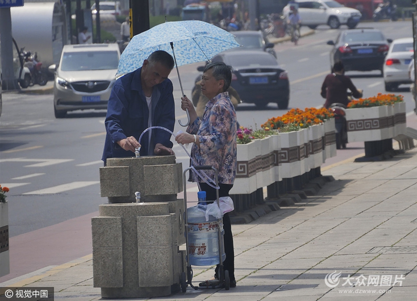 2017年5月10日,濟南大明湖路,個別市民在用水管和水桶在直飲水點取水。