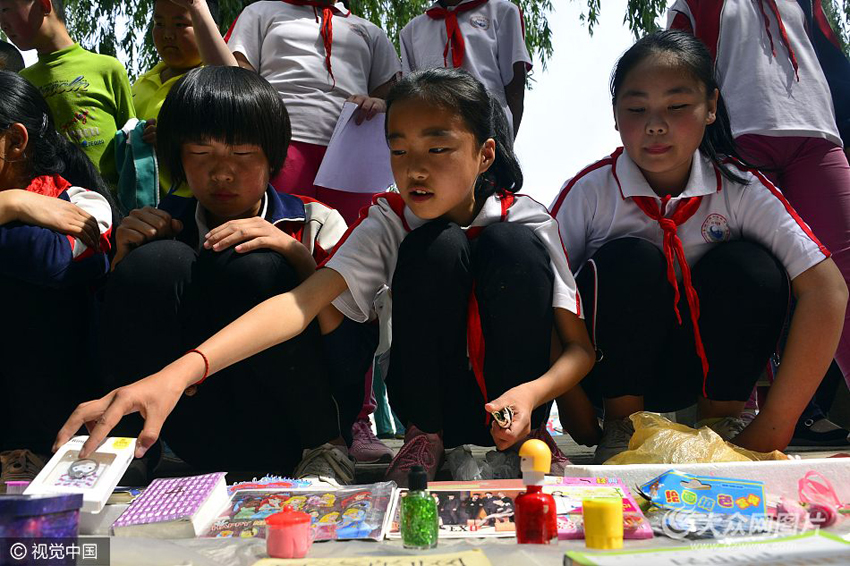 5月11日,聊城茌平縣洪屯鎮(zhèn)成莊小學(xué),學(xué)生們在淘寶節(jié)上買賣商品。