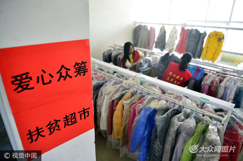 5月23日,在聊城市茌平縣愛心茌平眾籌扶貧運(yùn)營(yíng)中心的扶貧超市,工作人員在整理愛心單、人士捐贈(zèng)的衣服。