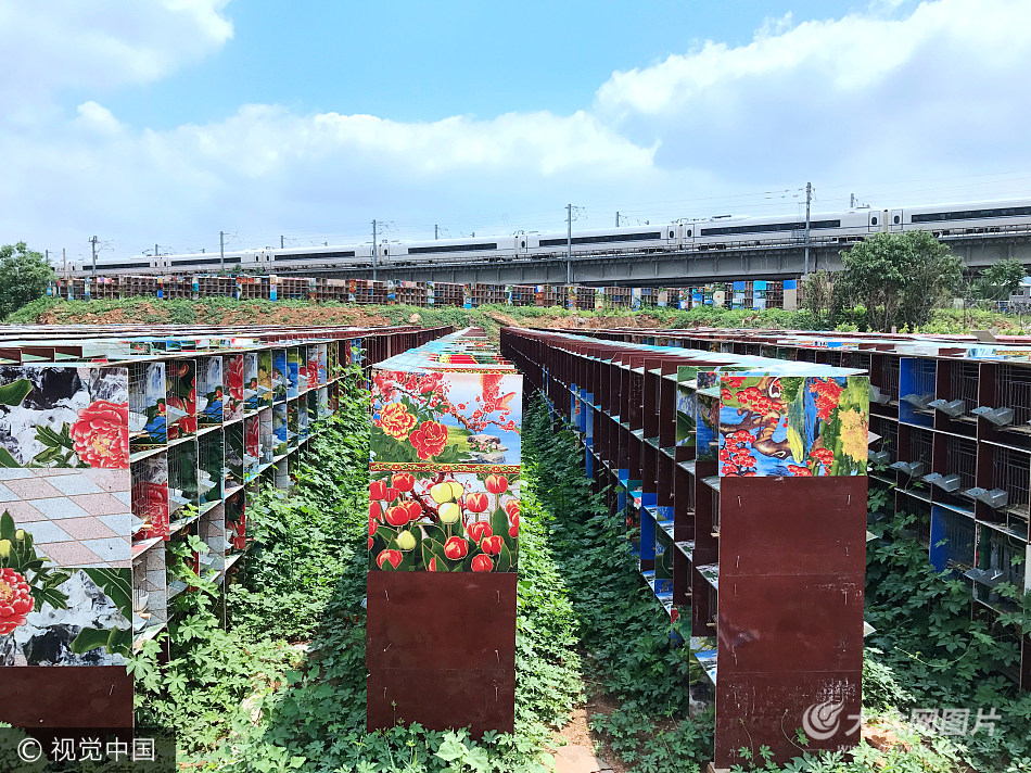 2017年5月24日,山東省濟南市,在二環南路西首北側的市中區七賢鎮井家溝村,京滬高鐵聯絡線西側有一塊面積約4000平方米的空地,原本這里一片葡萄園,后來村民搭建起了一排排養殖籠。從高空俯瞰,數百排養殖籠密密麻麻的排列在一起,每排共有四層,可以同時飼養超時10萬只家禽。每個養殖籠的頂部都覆蓋著印有圖案的陶瓷板,圖案中不僅有花鳥魚蟲,還有福祿壽喜吉等字樣,如用整整齊齊的麻將牌。這些養殖籠建成后一直沒有投入使用,籠舍周邊長滿了雜草,從5月24日開始,該片區實施拆遷改造。31日,記者從拆遷現場看到,養殖籠已經全部拆除,大片的渣石碎片等待清運,周邊的居民也已經搬遷完成,該片區土地平整之后,初步規劃用于污水處理站建設。