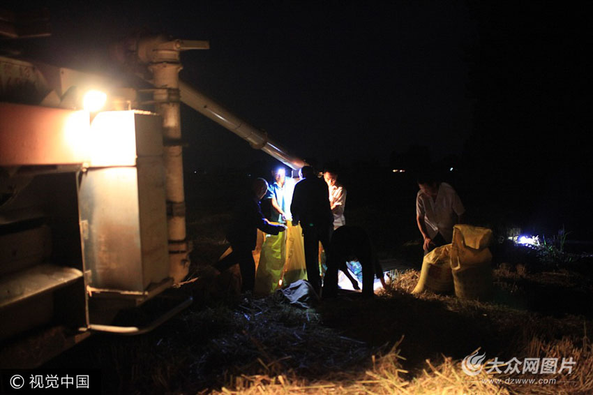 6月8日,平邑縣地方鎮小廣良村,農民駕駛收割機利用晴好天氣夜間收割小麥,確保小麥及時顆粒歸倉。