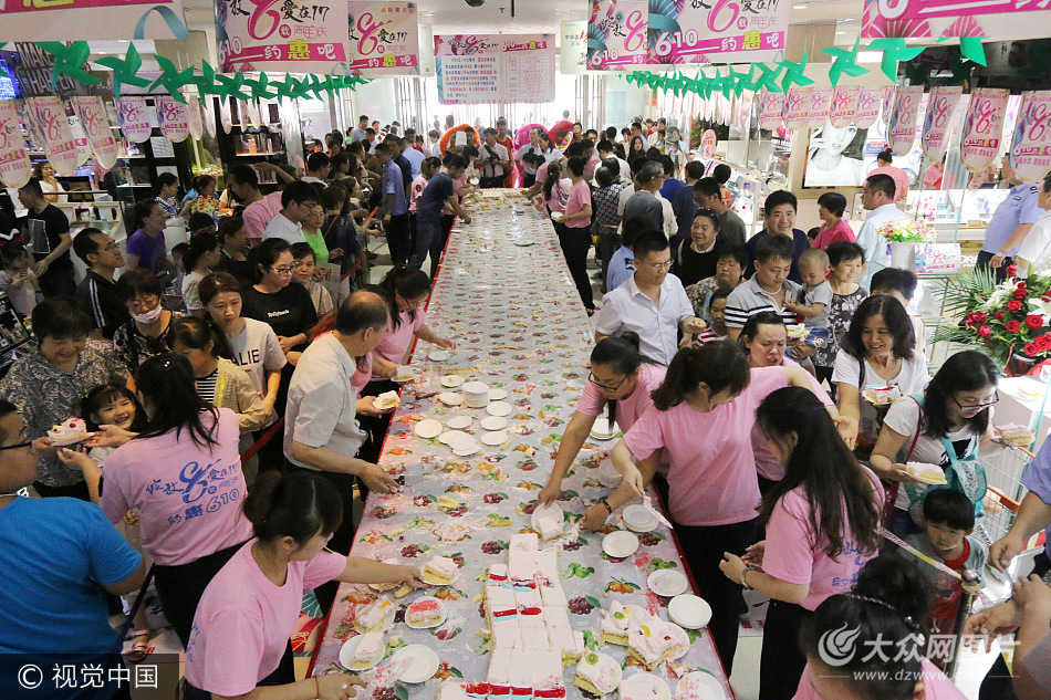 6月10日,濱州一商場搞店慶獻禮活動,專門請糕點公司制作了一只十米長超大蛋糕,免費提供給現場的市民。近千人在蛋糕兩側分別排成數十米的長隊,場面壯觀不輸春運。