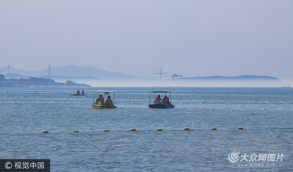 2017年6月14日下午,山東威海市榮成市,那香海景區海面出現平流霧。隔海望去,霧氣籠罩中的海岸仿佛懸浮在空中一般。